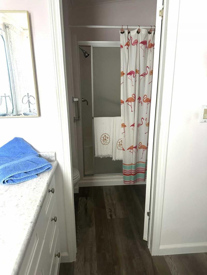 A small ramp leads from the All Seasons Room to the laundry area and guest bathroom. You then enter the main living area, which features a bright and welcoming open concept connecting the living, dining, and kitchen spaces. The kitchen has been beautifully remodeled and is bright and roomy, boasting elegant Granite countertops everywhere. Enjoy viewing the outside from the windows positioned right at the sink!