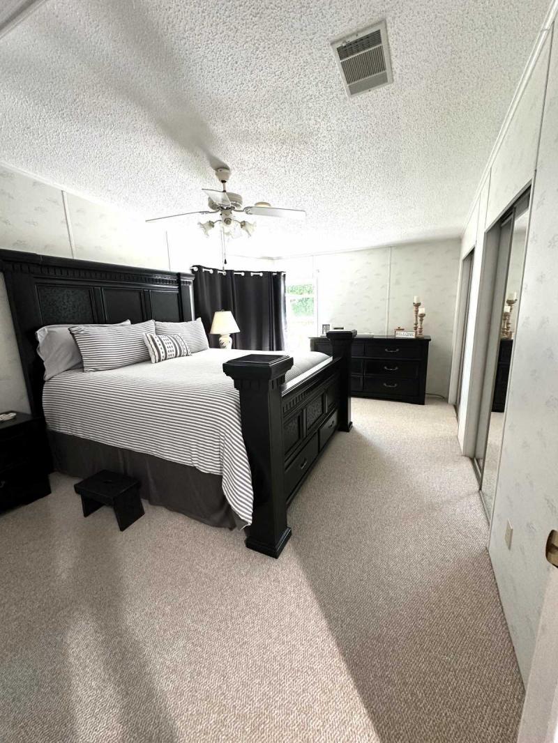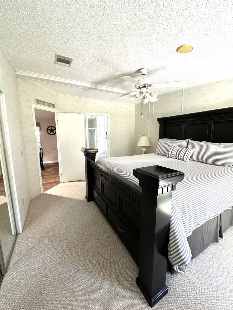 The home utilizes a desirable split plan for maximum privacy for your guests. The primary bedroom is large and features a walk-in closet and a separate linen closet. The space where the washer and dryer used to be is now a large closet, offering extra storage. Comfort is enhanced by ceiling fans and skylights. The flooring is a mix of hard surface throughout the main areas and cozy carpet in the bedrooms.
