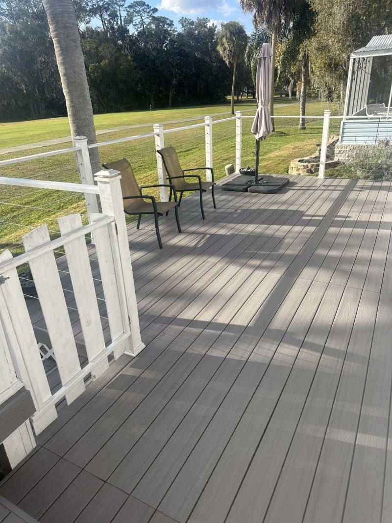 Deck: A long deck offering beautiful views of distant golfers, ponds, nature. Deck is length of the home and is a great part of the selling point of the home. All new poly Vynle deck was just added and so much room for guests. Accessible from both the main bedroom and the All Seasons room.