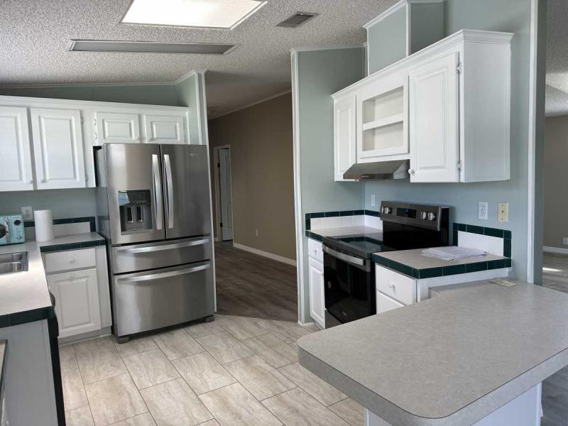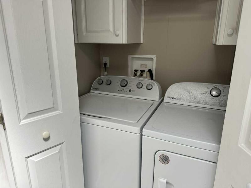 The kitchen is a chef's dream, with new flooring, replenished cupboards, and modern appliances including a stainless steel fridge and an induction-air fryer oven. The laundry room, accessed from the large garage, features new washer and dryer units and a convenient desk area. NEW FLOORING THROUGH OUT