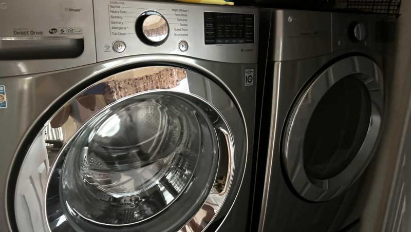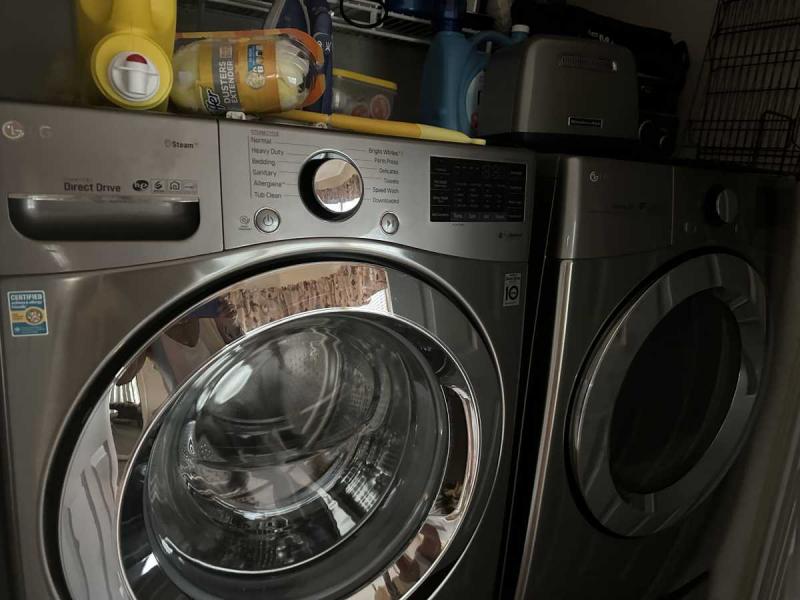 Black Stainless Suite: The kitchen is fully equipped with sleek black stainless steel appliances, including a matching washer and dryer.