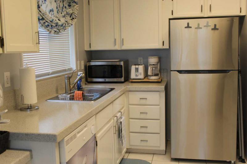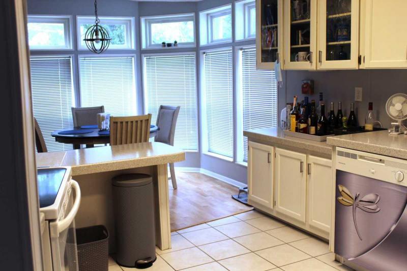 Modern kitchen with new refrigerator, microwave, updated cabinet drawer pulls, and a bright breakfast area.