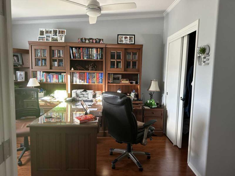The first guest bedroom is currently utilized as a functional office space. The second guest bedroom is nicely furnished with twin beds, providing comfortable accommodations for visitors.