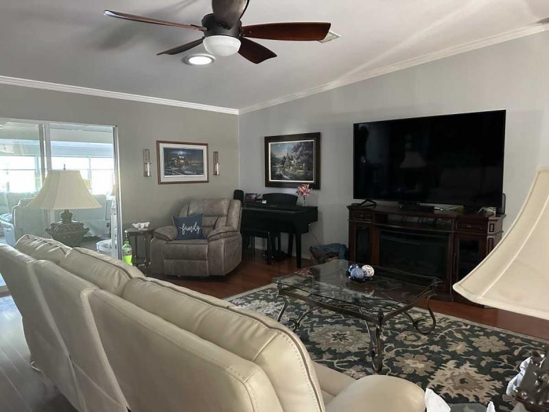 The expansive Florida room offers breathtaking views of the golf course and pond, creating a serene and inviting space. A separate air-conditioning unit ensures year-round comfort.