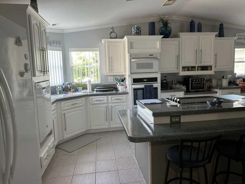 The huge kitchen is a culinary enthusiast's dream, featuring a large center island for prep work and casual dining. An abundance of storage ensures everything has its place. Enjoy the dual deep sink with picturesque views overlooking the golf course. A built-in desk area at the end of the cabinets adds functionality, and there's ample room for a table and chairs for a cozy eat-in area.